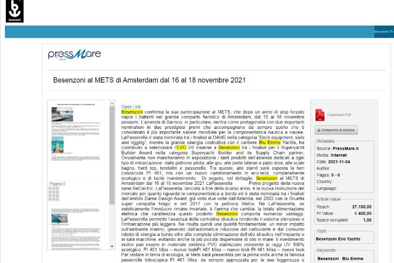 Besenzoni confirms that it will take part in the METS, which after a year when it couldn’t be held is opening its doors again at the Amsterdam exhibition centre from 16 to 18 November.