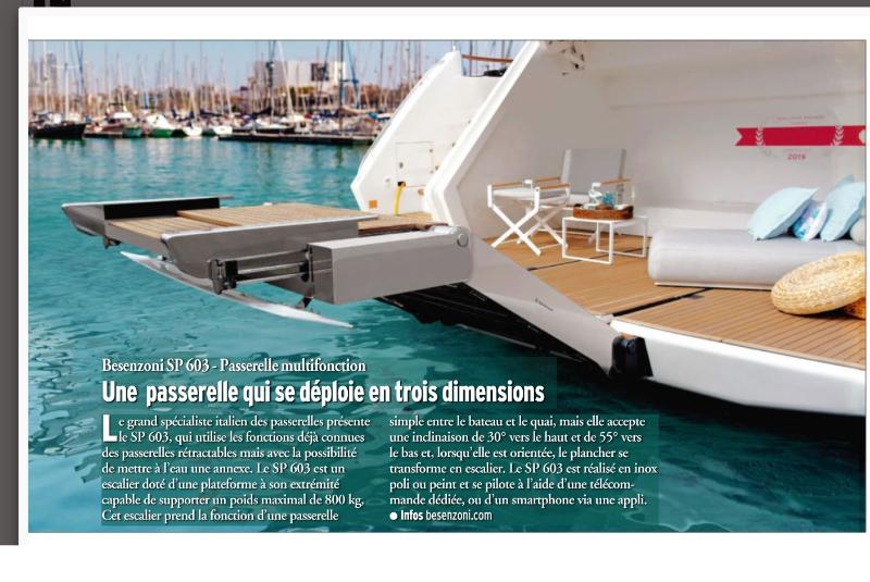Le grand spécialiste italien des passerelles présente Lle SP 603, qui utilise les fonctions déjà connues des passerelles rétractables mais avec la possibilité de mettre à l’eau une annexe. Le SP 603 est un escalier doté d’une plateforme à son ...