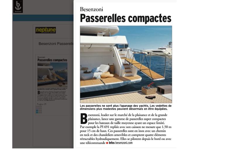 Besenzoni, leader sur le marché de la plaisance et de la grande plaisance, lance une gamme de passerelles super compactes pour les bateaux de taille moyenne ayant un espace limité. Par exemple la PI 691 repliée avec son caisson ne mesure que 1,50 m ...