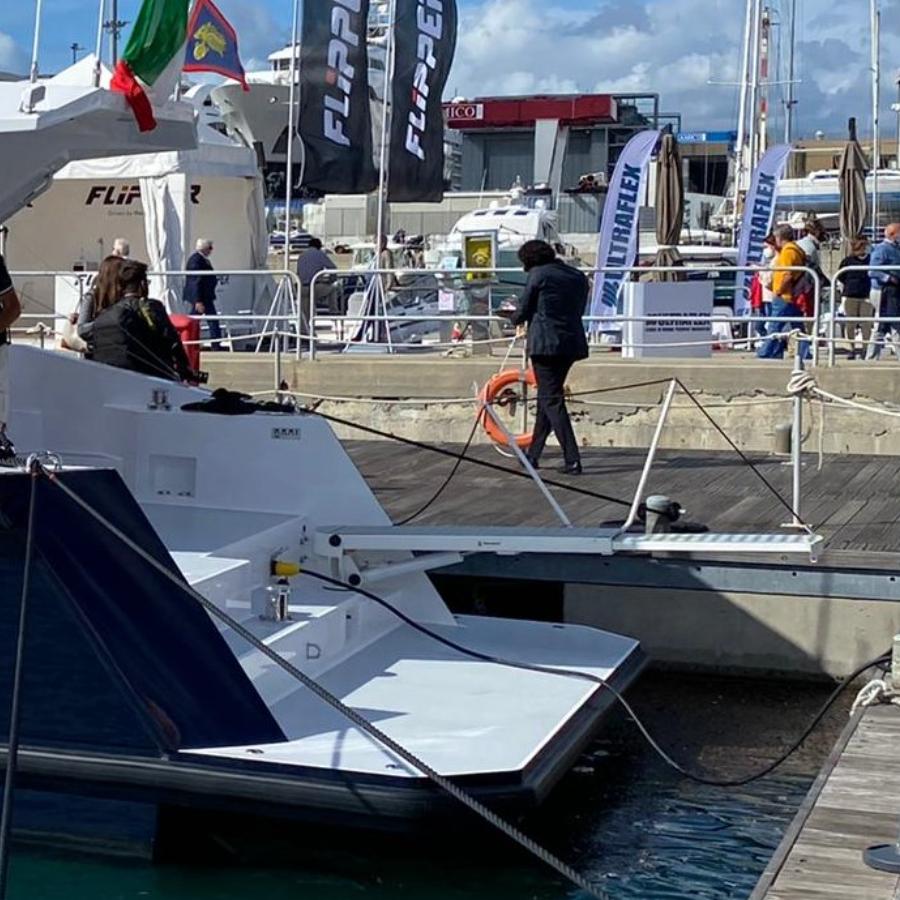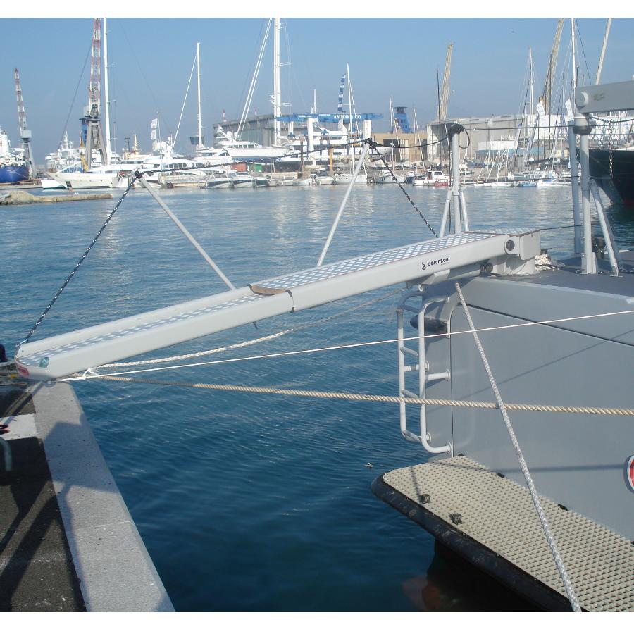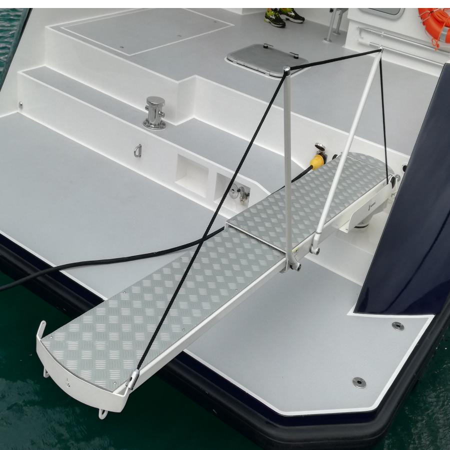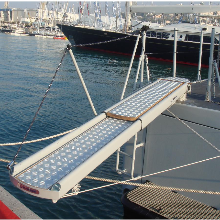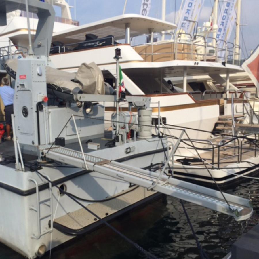 Versatile product, with fully automatic movements.The range of external hydraulic gangways includes models with two or three telescopic stages, with or without rotation and with the possibility of being used also as a crane for lifting loads up to 200 kg. The structure is made of powder-coated stainless steel to ensure greater resistance in a marine environment. The footboard is in aluminum cheker plate or covered with non-slip material. The whole series is equipped with an infrared or radio wave remote control for maximum functionality of use .